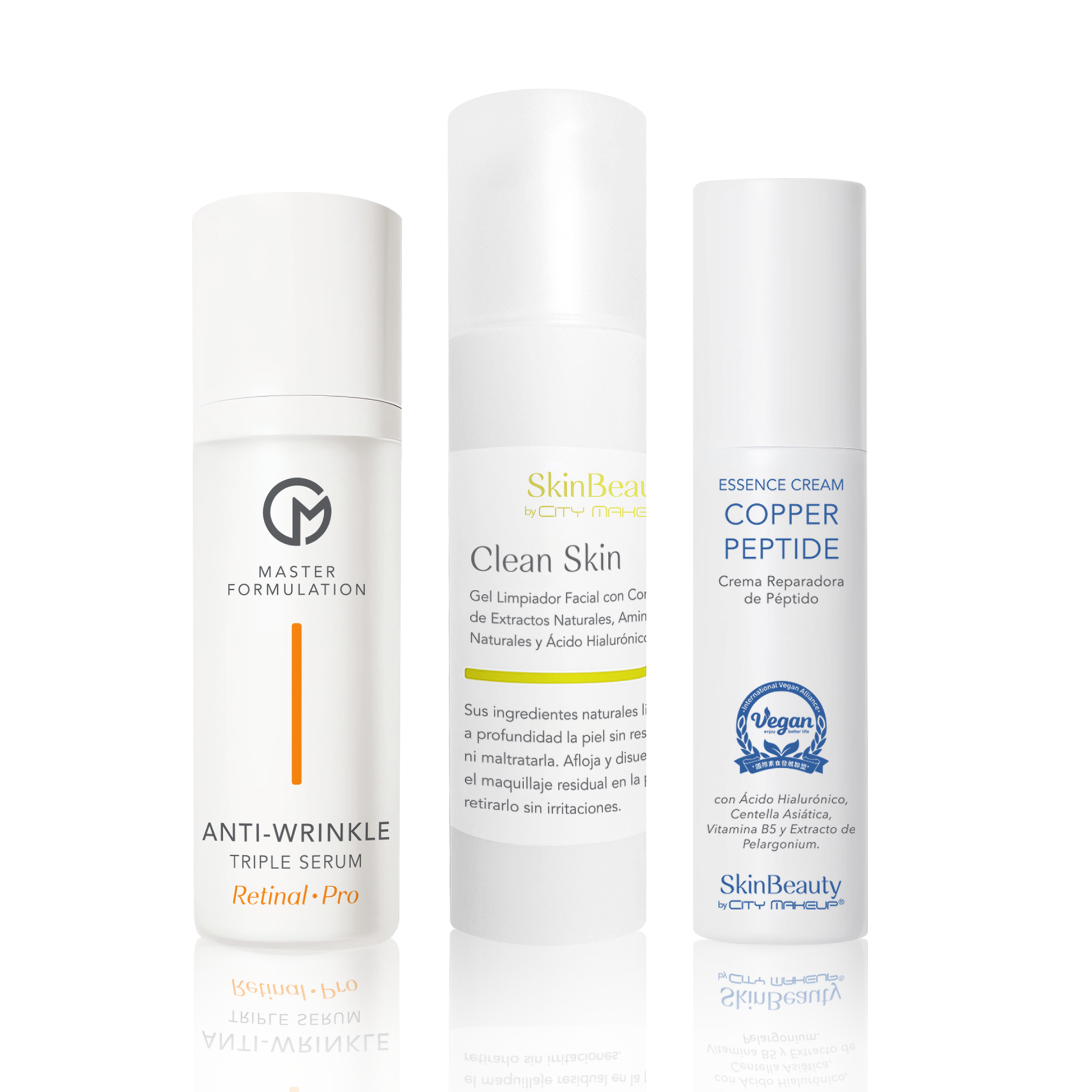 Productos Incluidos: - Clean Skin (Ge Limpiador suave e hidratante) - Essence Cream Copper Peptide (Regenera la piel y refuerza la barrera cutánea) - Anti-Wrinkle Triple Serum (Reductor de arrugas faciales)